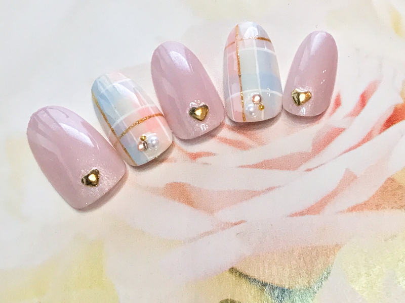 パステルカラーの淡いチェックに、ハートのスタッズで、女子力の高いネイル。