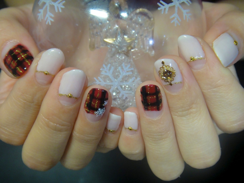 赤のチェックと雪の結晶がポイントの、さりげない派手すぎないクリスマスネイル。